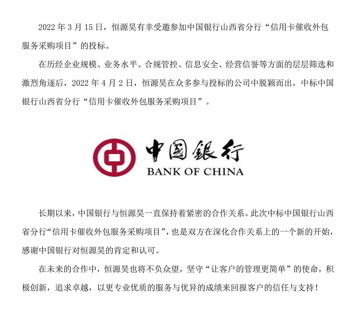 喜報(bào)!恒源昊中標(biāo)中國(guó)銀行山西省分行“信用卡催收外包服務(wù)采購(gòu)項(xiàng)目”
