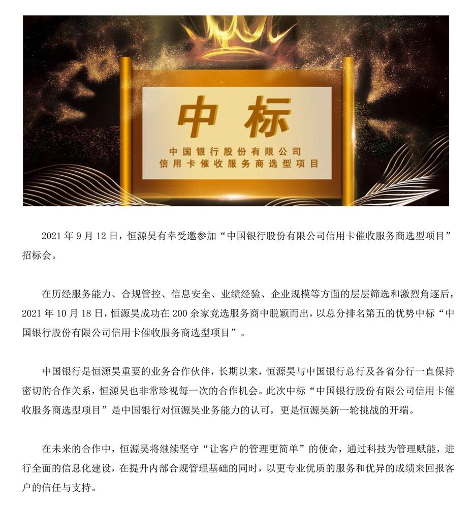 恒源昊中標(biāo)“中國銀行股份有限公司信用卡催收服務(wù)商選型項(xiàng)目”
