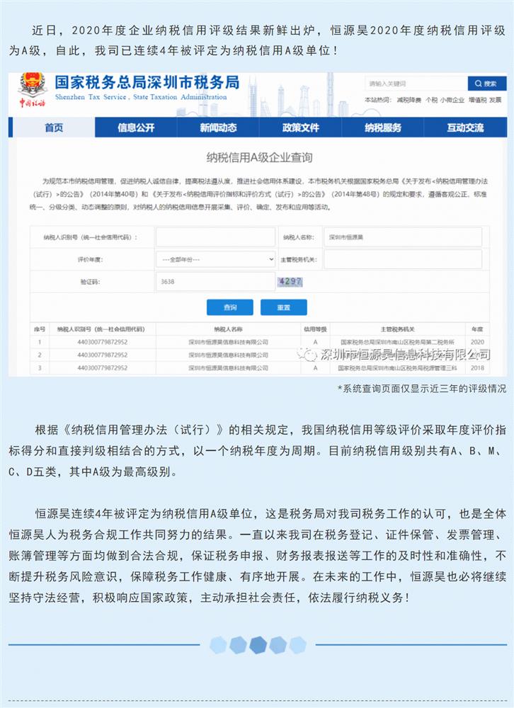 喜報|恒源昊連續(xù)4年納稅信用評級為A級!